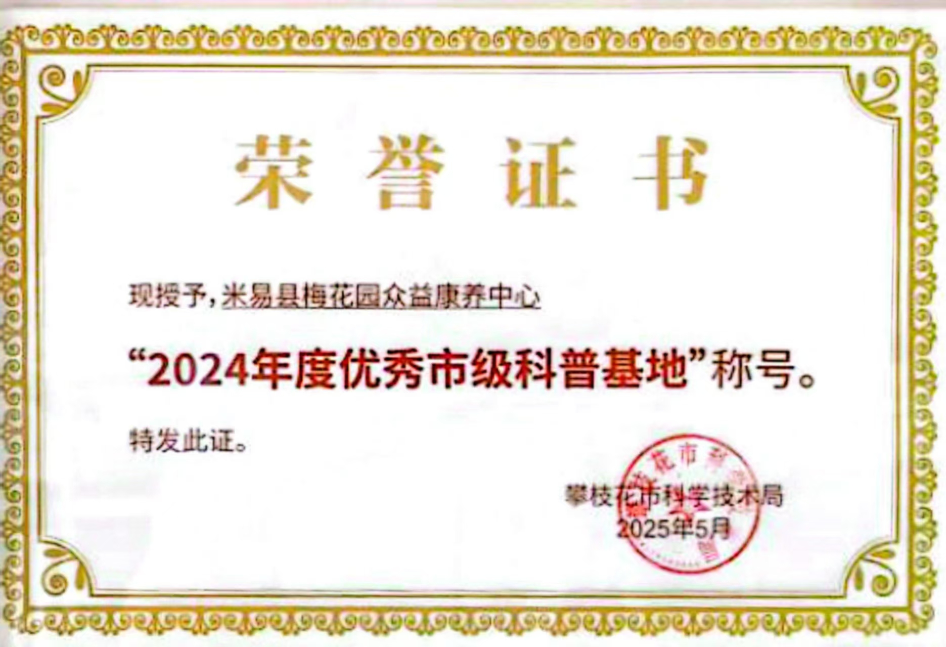 梅花园众益康养中心荣获“2024年度市级 优 秀 科普基地”称号